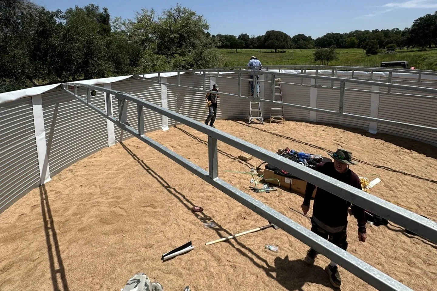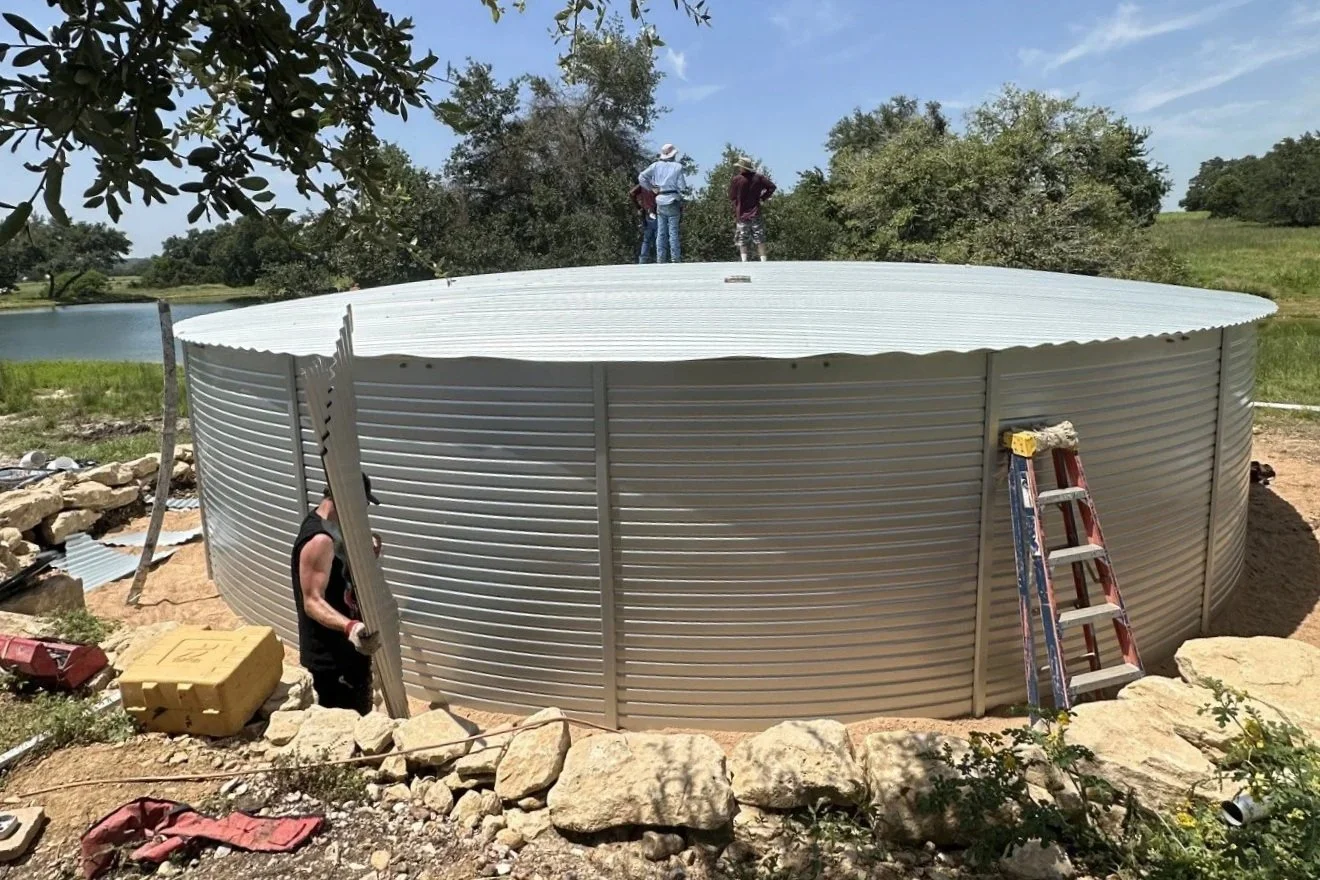 Once the trusses are up, the roof panels go on. Depending on the tank model, this may include a vent or access hatch.